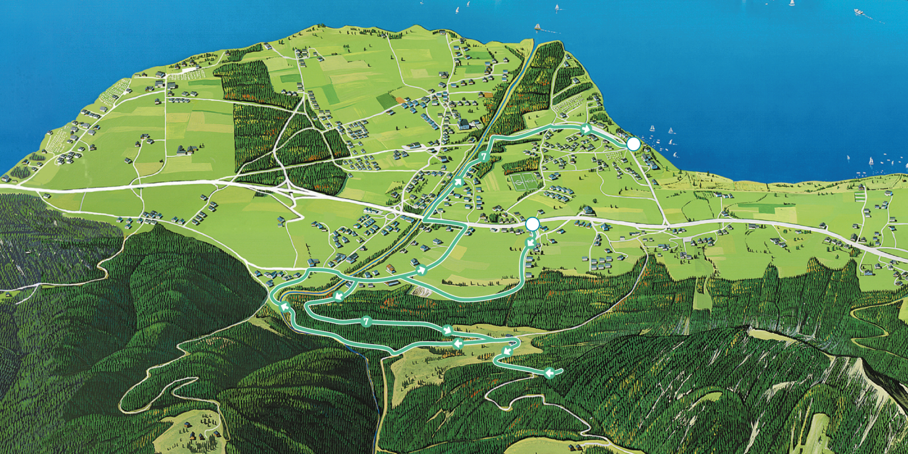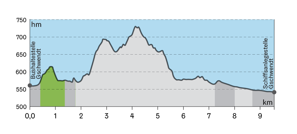 Nachdem du dich beim Arboretum aktiv bewegt hast, setzt du deine Wanderung entlang der Straße und des Zinkenbach Wanderweges fort und folgst der Beschilderung, bis du die Schiffsanlegestelle Gschwendt erreichst, wo dieser Pfad endet.