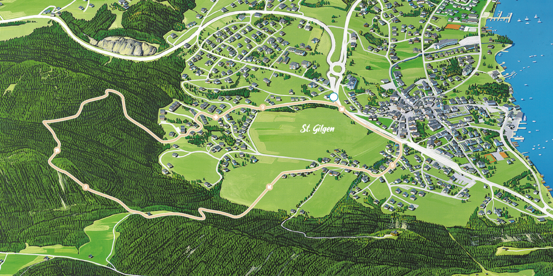 Sobald du den Mozartblick erreichst, kannst du den Blick auf das malerische Wolfgangsee-Panorama genießen und in die Musik deiner Gedanken eintauchen. Der Mozartblick gilt als einer der schönsten Aussichtspunkte über St. Gilgen. Nach dem Mozartblick beginnt dein Abstieg in Richtung des Ausgangspunktes. Auf dem Weg findest du beim Waldrand die Annenquelle, wo du dich mit frischem Trinkwasser versorgen kannst. Schließlich kehrst du zurück zum Informationsbüro St. Gilgen, wo der Amadeuspfad sein Ende findet.