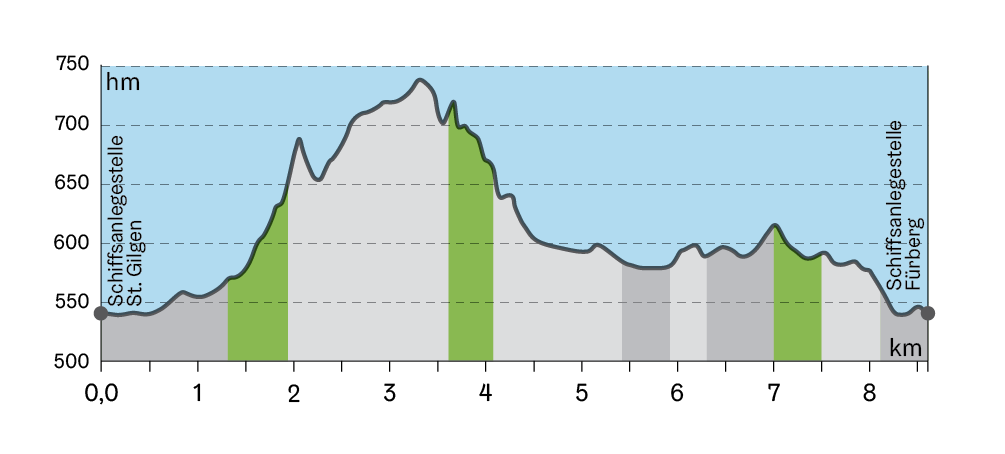 Während du weitergehst, denke bewusst über den Zauber des Dialoges und der Versöhnung nach. Jeder einzelne Schritt, den du machst, soll dich daran erinnern, dass Frieden keine Selbstverständlichkeit ist. Du hast die Möglichkeit, aktiv dazu beizutragen, eine Welt voller Frieden und Harmonie zu schaffen, indem du den Weg des Dialoges und der Vergebung wählst. Lass diesen Gedanken tief in dein Herz eindringen und trag die Botschaft des Friedens bei dir. Schließlich führt dich der Friedenspfad zur Schiffsanlegestelle Fürberg, wo deine Reise endet. Hier kannst du innehalten und die besondere Atmosphäre beim See genießen. Nimm dir einen Moment Zeit, um die Eindrücke und Erlebnisse deiner Wanderung zu reflektieren.