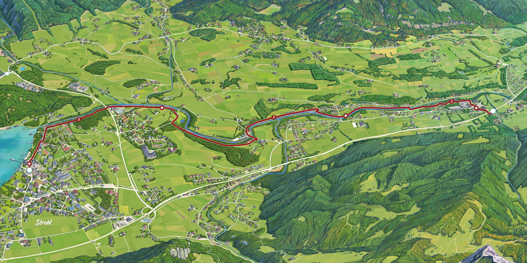 Der Seidenfadenpfad entlang der Ischler Ache startet im Zentrum von Strobl. Von hier geht es in Richtung der Wolfgangsee-Klause und du folgst dem Wanderweg entlang der Ischler Ache. Der Ausfluss des Wolfgangsees bezeichnet die Landesgrenze zwischen Oberösterreich und Salzburg. In der Mitte der Klaus- oder auch Achbrücke steht eine Blechschnittfigur des Heiligen Wolfgang im Bischofs-Ornat mit dem Bischofsstab und der Kirche von St. Wolfgang in seinen Händen. Die Brücke wurde um 1840 errichtet und war die erste richtige Landverbindung von Strobl nach St. Wolfgang.