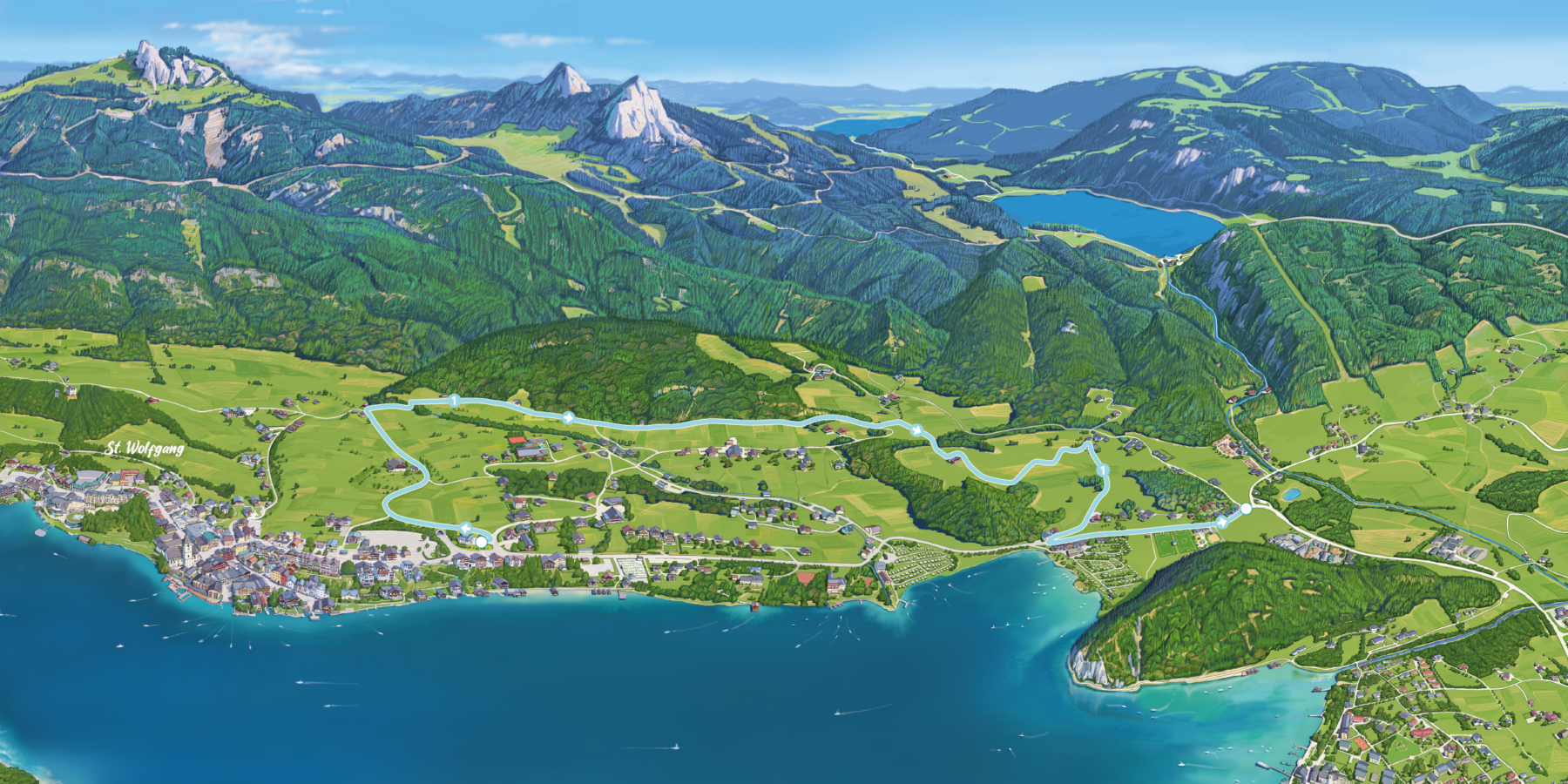 Der Sonnenpfad startet direkt beim Informationsbüro St. Wolfgang und bietet dir eine malerische Wanderung über den Dächern von St. Wolfgang. Gleich zu Beginn geht es etwas bergauf zu einem „Ahornplatzl“, einem schattigen Plätzchen mit großen, alten Ahornbäumen. Diese ehrwürdigen Bäume haben hier schon vor über 300 Jahren ihr Zuhause gefunden. Sie sind Zeugen vergangener Zeiten, strahlen eine gewisse Ehrfurcht aus und laden dich ein, um einen Moment der Ruhe und Besinnung zu finden.
